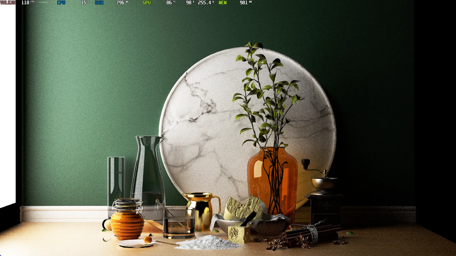目前我的开发主要在120-240hz的显示器上进行,我尽量将渲染器的运行效率控制在120hz以上,我就会发现,截图下来的图像,和我肉眼看到的图像,质量已经有非常大的差距了。这就是“人眼补帧”。